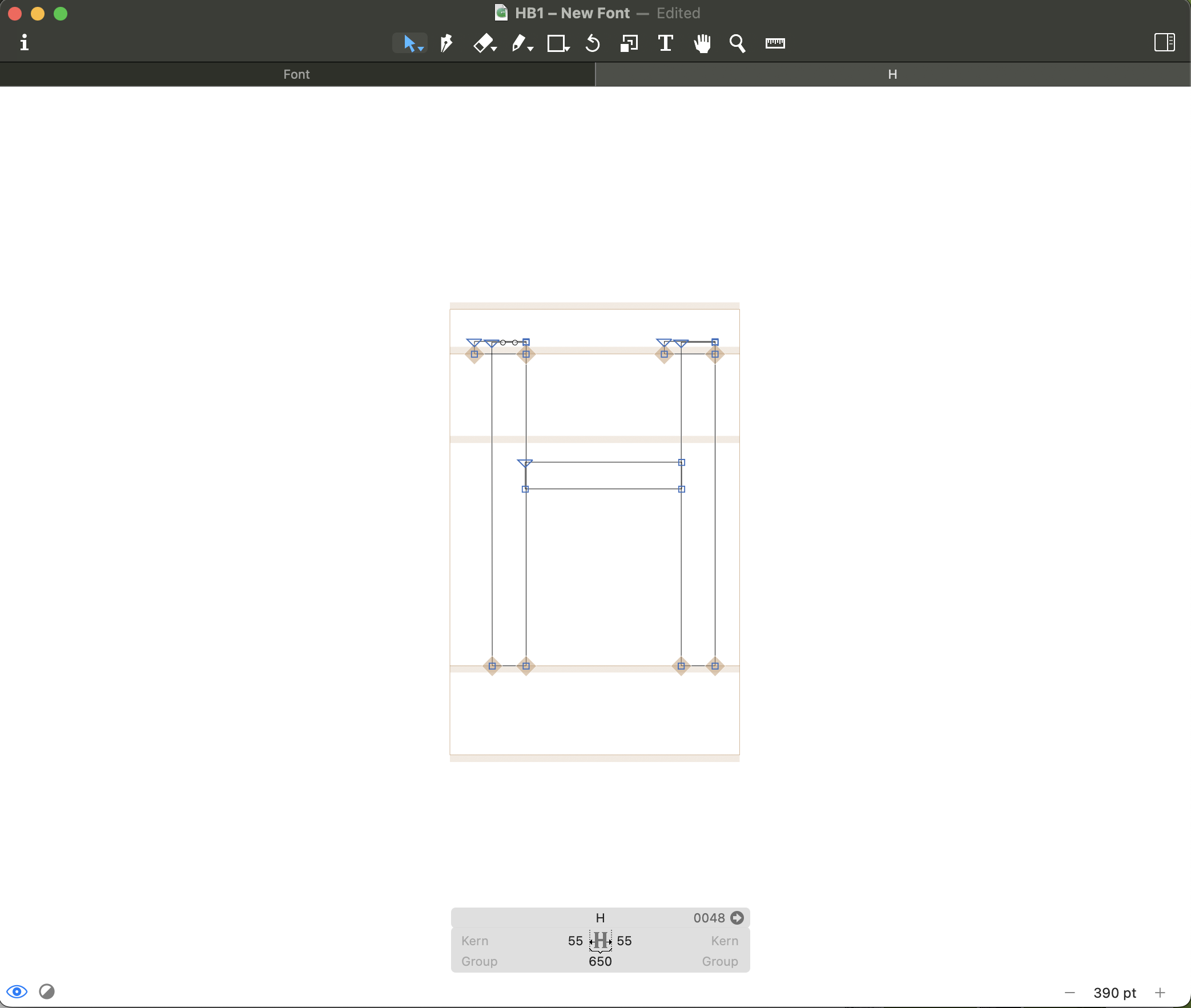 서체 제작을 위해 선택한 도구는 글리프스(Glyphs)이다. 이 프로그램은 맥(Mac) 환경에서 벡터 기반의 글자를 설계하는 데 최적화된 업계 표준 소프트웨어이다. 어도비 일러스트레이터와 유사한 벡터 방식이지만, 폰트 제작에 필수적인 메트릭스(Metrics)와 커닝(Kerning)을 조절하는 데 훨씬 정교한 기능을 제공한다는 점이 특징이다. 간단히 말해서 일러스트 툴들을 작업할 수 있다면 어렵지 않게 글리프스 툴도 사용가능하다. 오히려 자동으로 직선이나 곡선을 교정해주어서 실제 일러스트 작업보다 더 편했다.