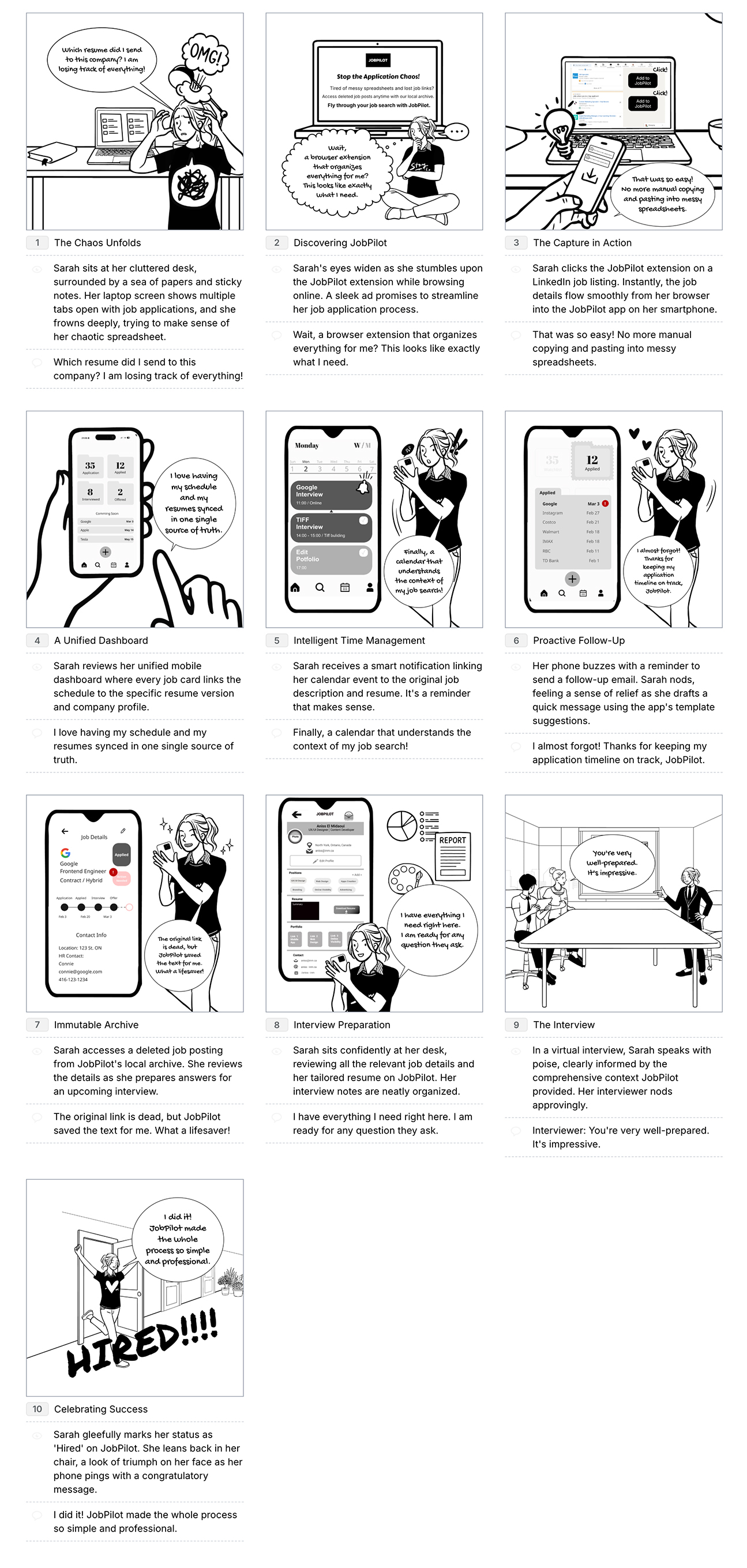 - 시나리오 기반 스토리보드 (Scenario-based Storyboard): 앱 화면의 세부 요소보다는 사용자가 앱을 사용하는 구체적인 상황과 맥락에 초점을 맞춘다. 예를 들어, 구직자가 버스 안에서 한 손으로 앱을 켜서 면접 일정을 확인하는 장면 등을 만화처럼 묘사한다. 이는 디자인 원칙 중 하나인 사용자에 대한 공감(Empathy)을 형성하는 데 매우 유용하다. 쉽게 생각하면 영화 시놉시스 그리는 과정이랑 비슷하다고 할 수 있다. 특히 드로잉을 잘하는 디자이너라면 훨씬 유리하다.